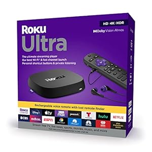 Roku Ultra | The Ultimate Streaming Device 4K/HDR/Dolby Vision/Atmos, Rechargeable Roku Voice Remote Pro, Ethernet Port, Hands-Free Controls, Lost Remote Finder, Free & Live TV