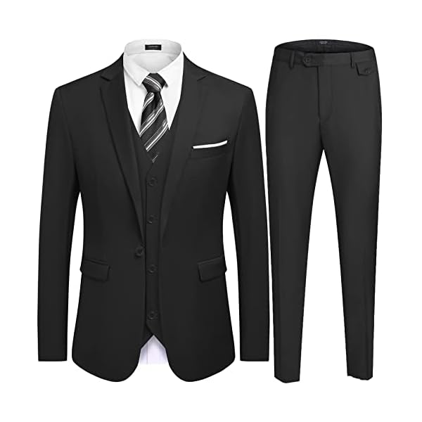 【CLASSIC DESIGN】- Top: One button closure blazer jacket with one decorative welt chest real pocket, two inner pockets and two side flap pockets, features notched lapel and buttoned cuffs; Bottom: Flat front pants with two side slanted pockets, two back buttoned pockets and come with invisible elastic waist; Waistcoat: Four buttons closure suit vest with V-Neck, smooth back, adjustable belt and two functional side pockets.
